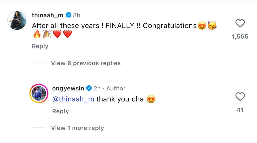 The badminton world quickly rallied behind the newly engaged pair, with fellow athletes including Lee Chong Wei, Loke An Yew Thinaah M. and adoring fans flooding the comments section with warm congratulations and heartfelt messages.